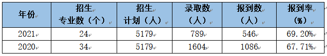 依据说明: 1.2.1 2021年普通高职招生报到率比2020年增长1.49% 2021年普通高职招生录取人数为789人,报到数为546人,较2020年略有减少。2021年普通高职报到率比2020年增长1.49%。 表1-2-1-1 2020、2021年普通高职实际报到明细表