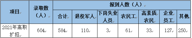 1.2.2 高职扩招分类招生培养超额完成任务,完成招生604人 根据《广东省教育厅等八部门(单位)关于做好2021年高职扩招工作的通知》(粤教职函〔2021〕28号)等文件精神及相关要求,我校积极做好高职扩招专项工作。2021年高职扩招专项行动采用院校自主招生方式,招生主要面向退役军人、下岗失业人员、农民工、高素质农民、企业在职员工、基层在岗人员等社会人员。省教育厅2021年给我校下达招生计划600人,我校最终录取604人,超额完成任务。实际报到584人,报到率达96.6%。高职扩招完成情况如下: 表1-2-2-1 2021年高职扩招情况统计表