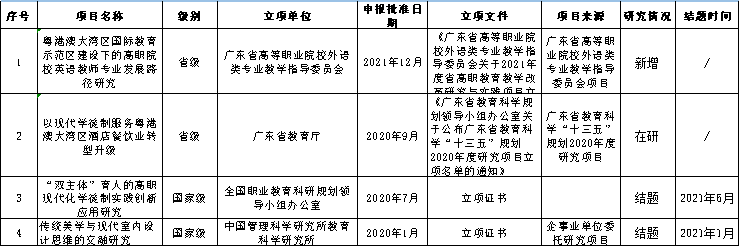 依据说明:     3.1.1省部级以上科研平台、项目和奖励情况   2021年我校省级以上教科研项目结题2项,在研1项,新增广东省高等职业院校外语类专业教学指导委员会1项,具体情况如下表: