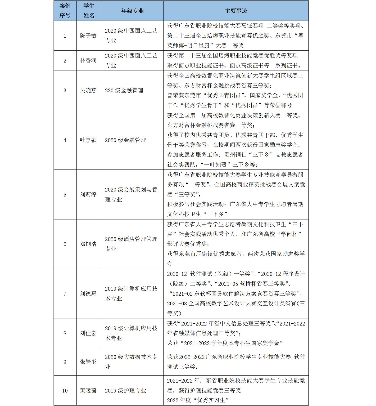表2-7-1-2 10名优秀在校生或应届毕业生案例一览表