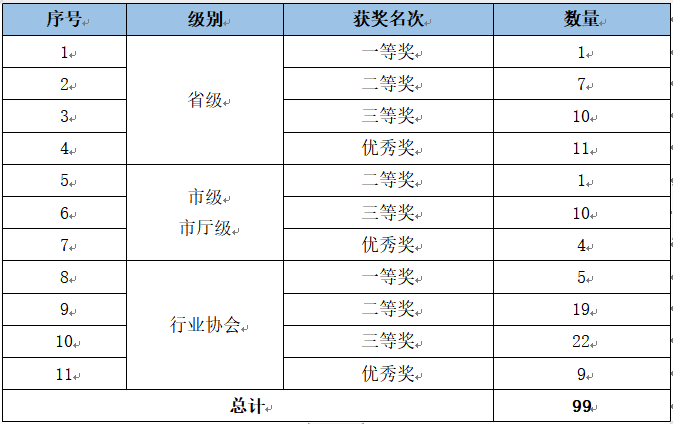 2022年我校校外技能竞赛斩获颇丰,各院系各专业组织学生参加省市级技能竞赛大奖、行业协会,共计获得99项奖项,其中获得省级奖项共计29项,获得市厅级15项。