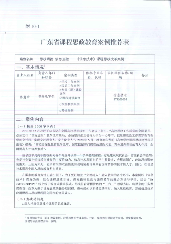 广东省课程思政教育案例推荐表-思政明德 信息互融——《信息技术》课程思政改革案例-陈慧君-教学申报